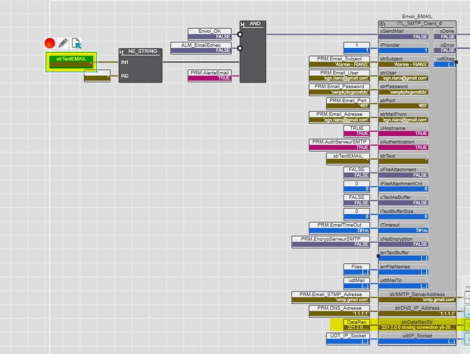 • Si le “DataRec” est vide, écrire 'test' dans le buffer strTextEMAIL et vérifier que le mail s'envoie correctement (“DataRec en “closing connection” à la fin de l'envoie)