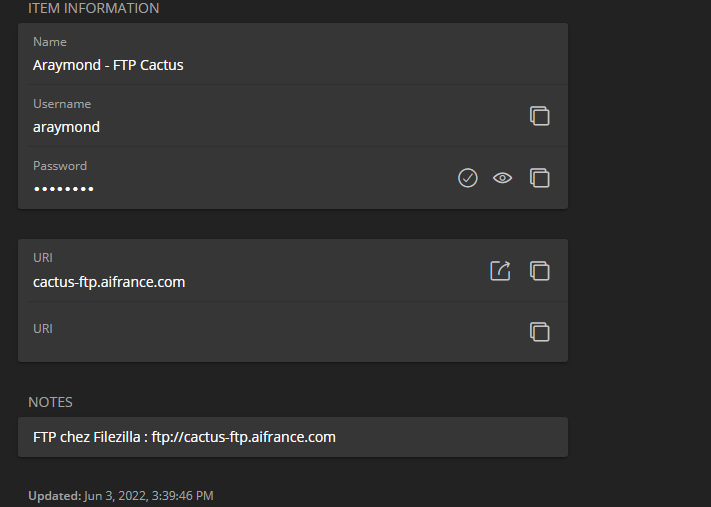 Pour finir, il est possible de contrôler le bon retour à la normale en se connectant via Filezilla au FTP sur lequel les données sont poussées. Les accès FTP sont disponibles sur Bitwarden :
