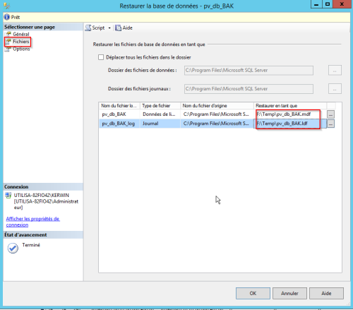 Lancer la procédure. Il se peut que cela échoue la première ou deuxième fois. Actualiser la fenêtre en décochant/cochant un onglet ( par exemple “Remplacer la base de données existantes” vu précédemment ) pour faire remonter le bouton OK.