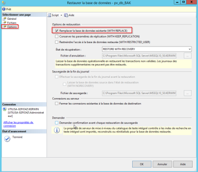 3. Options : Options de restauration → Cocher “Remplacer la base de données existantes”