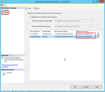 2. Fichiers : Changer la fin des 2 chemins d'accès “Restaurer en tant que” par : F:\Temp\mon_nom_de_fichier.mdf ( Le C étant surchargé cela permet de les stocker sur le F le temps de faire les différentes extractions )