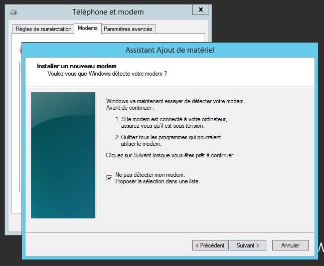 Cocher “Ne pas détecter mon modem.Proposer la sélection dans une liste”. Cliquer sur suivant