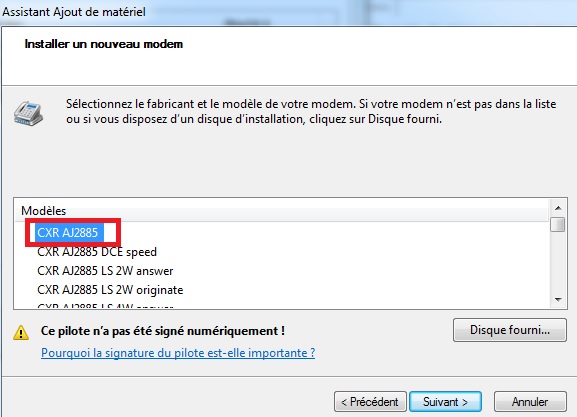 Cliquer sur disque fourni, indiquer le chemin du driver du modem. Une liste de modems s'affiche, sélectionner le bon modèle.Cliquer sur suivant