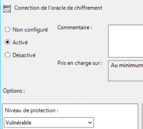 Une fois la page de délégation ouverte, double cliquer sur “Correction d'oracle de chiffrement” puis cliquer sur “activé” et passer la protection en vulnérable.