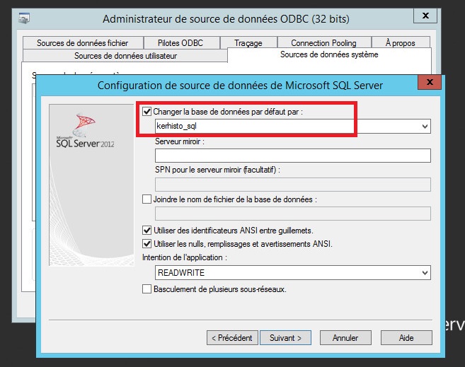 Dans ODBC 32 bits créer les sources de données système kerwin_sql et kerhisto_sql avec l'authentification Windows et ne pas laisser le lien par défaut mais bien sélectionner la bonne base de données.
