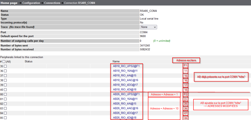 Exemple : L'exemple donné ici est celui de Delprat - PTR 2 (Lot 4). Déplacement de l'AB26 anciennement câblé sur le port COM9 (inexistant sur le nouvel API car 6 ports COM max) –> Vers le port COM4 qui contenait l'AB18
