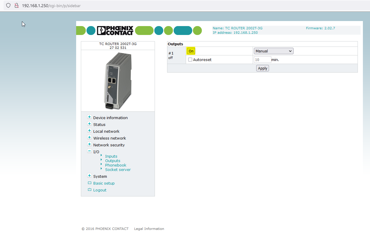 Une fois loggé, aller dans l'onglet I/O → Outputs , cliquez sur “On”, puis “apply”, attendez qq secondes puis cliquer sur “off” et “apply”.