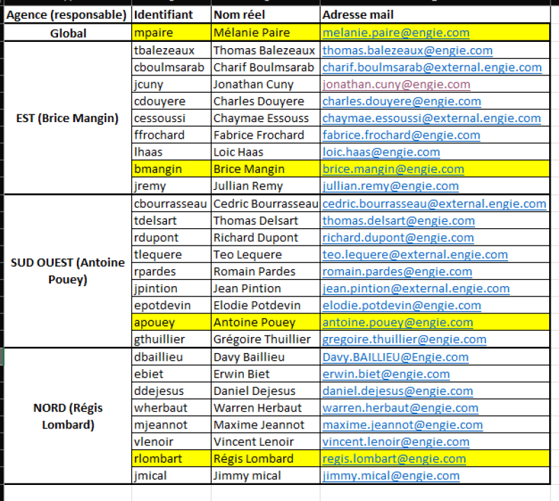 Pour connaitre le responsable de l'agence concernée par le ticket, il faut se référer au tableau suivant présentant la répartition des exploitants par agence :