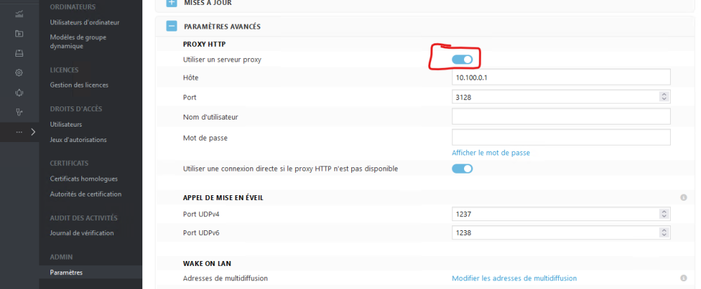 Pour pouvoir effectuer la synchronisation de la licence, il faut désactiver le proxy. Celui-ci se trouve dans les paramètres Admin sur la gauche de la page.