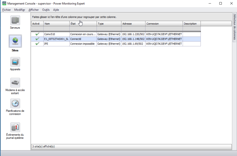 Vous pouvez configurer différents types de sites (liaisons de communication telles que Ethernet ou série) et établir des plannings de connexion pour ces sites.