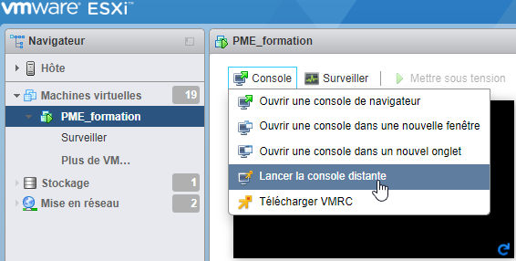 Machines virtuelles\PME_formation Puis depuis l'onglet Console faire Lancer la console distante