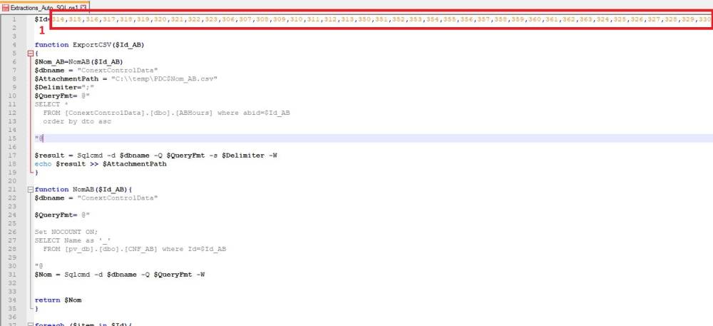 Comme indiqué sur l'image ci-dessous, il faut renseigner en haut du script les différents ID (d'AB dans notre cas) que l'on souhaite extraire via SQL en les séparant par une virgule.