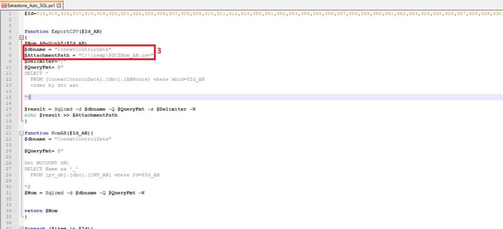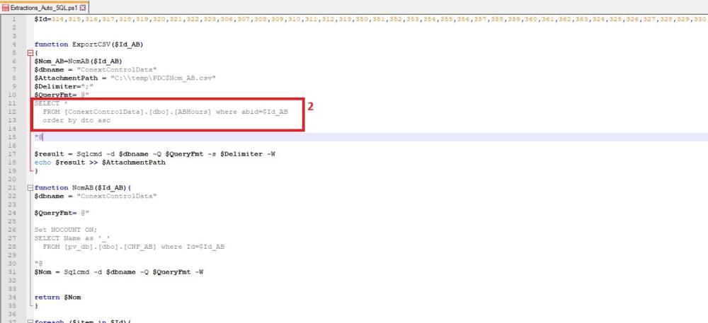 Remarque : Le script présenté dans cette procédure a été conçu initialement pour extraire des données d'AB sur une base de données Conext Control. Il est possible de l'adapter pour effectuer d'autres types d'extractions sur SQL.