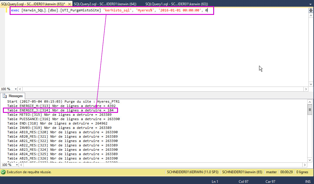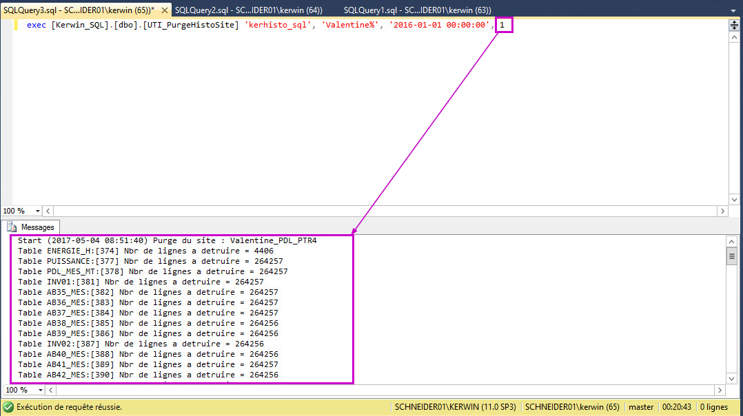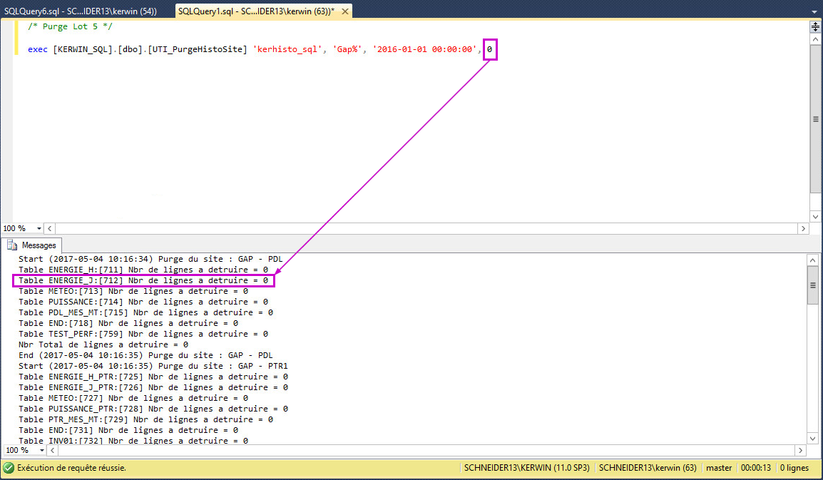 Si le nombre de jours correspond et que les dates sont correctes, modifiez la requête en remplaçant le dernier 0 par un 1 (cela lance réellement la requête de purge). A la fin, vous devez observer le résultats suivants (voir screenshot).