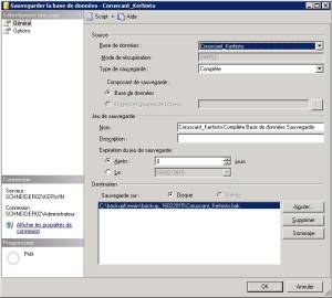 Ouvrez “Microsoft SQL Server Management Studio”. Faites un clic droit sur la base de données “kerhisto_sql” (le nom peut varier en fonction des lots) et allez dans “Tâches” puis “Sauvegarder”. Une fenêtre s'ouvre alors.