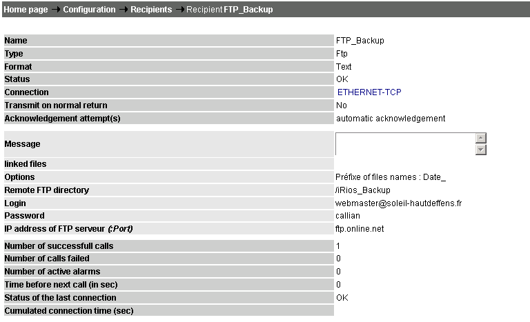Pour ajouter un nouveau destinataire FTP, cliquer sur destinataires d'alarmes → Ajouter un destinataire