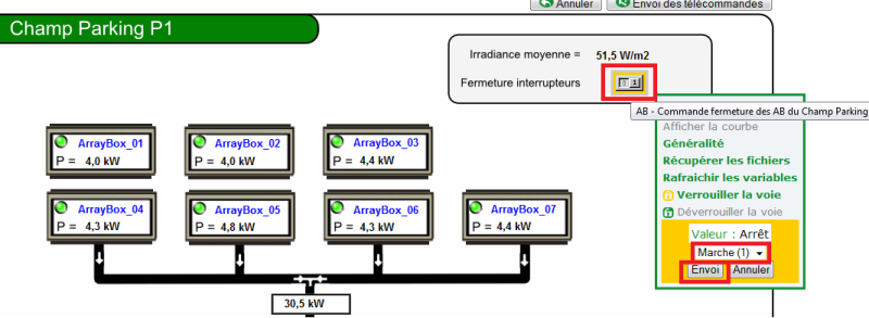 Fermeture individuelle: Aller dans le synoptique de l'array box concernée et comme pour la fermeture globale, cliquer sur le bouton de commande de fermeture.