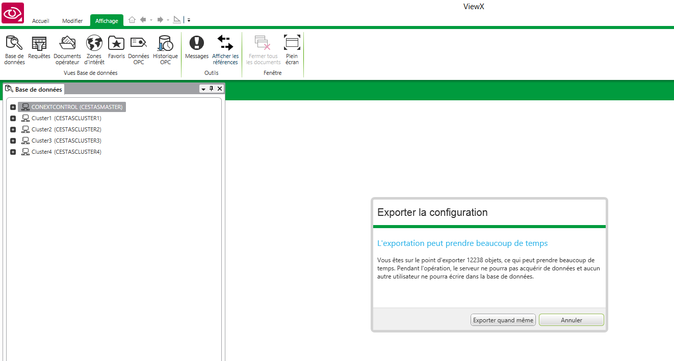 1) se connecter sur ViewX, sur le projet concerné 2) ClicDroit+“Exporter…” sur le projet (en tête de la colonne de gauche, pour la PJ, correspond à CONEXTCONTROL (MASTER))