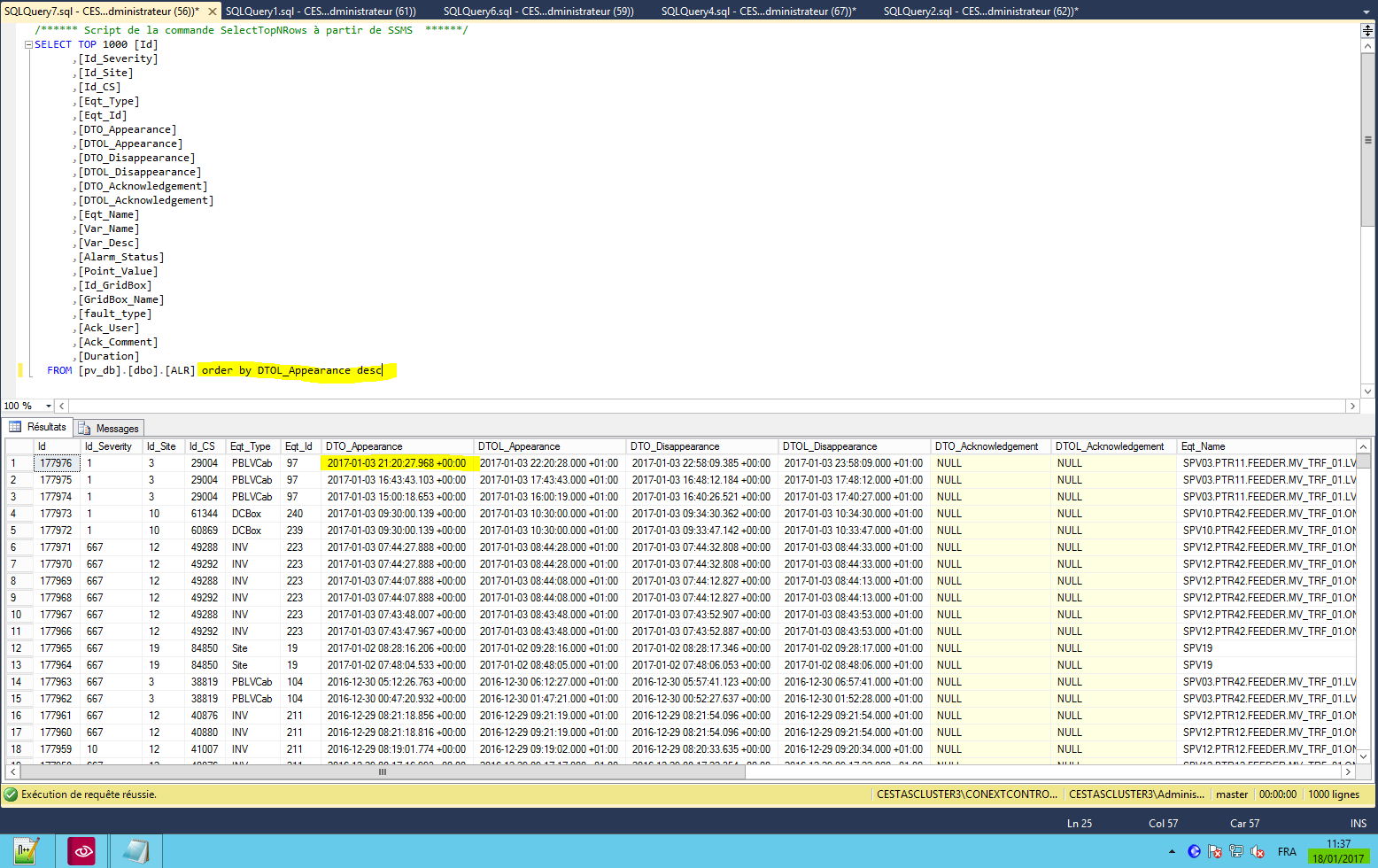 Attendre environ 30 minutes et rejouer la requete SQL dans la table ALR : si de nouvelles alarmes sont apparues, c'est OK. Rejouer alors les rapports des sites qui dépendent de cette table ALR.