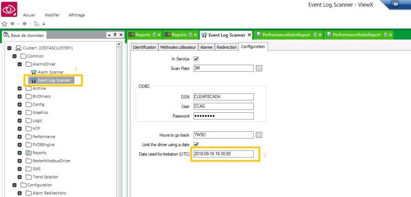 Si vous avez une erreur que la data table EventExport contient un nombre de ligne trop important il faut vous connecter sur le ViewX du cluster concerné. Il faut ensuite ouvrir les propriétés de l'Event Log Scanner afin de mettre la date de la veille dans la case “Date used for limitation”