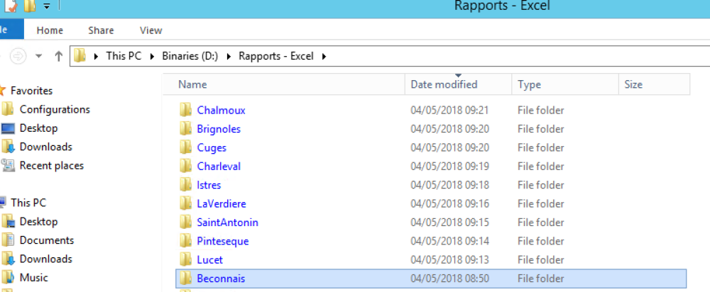 Les fichiers exportés automatiquement sont stockés sur le serveur SDSV162-VM dans le répertoire suivant : “D:\Rapports - Excel” :