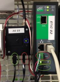 Ensuite, au démarrage de l'ETIC et donc du module 3G, une lumière verte doit se mettre à clignoter sur le module 3G (carré bleu sur la photo).