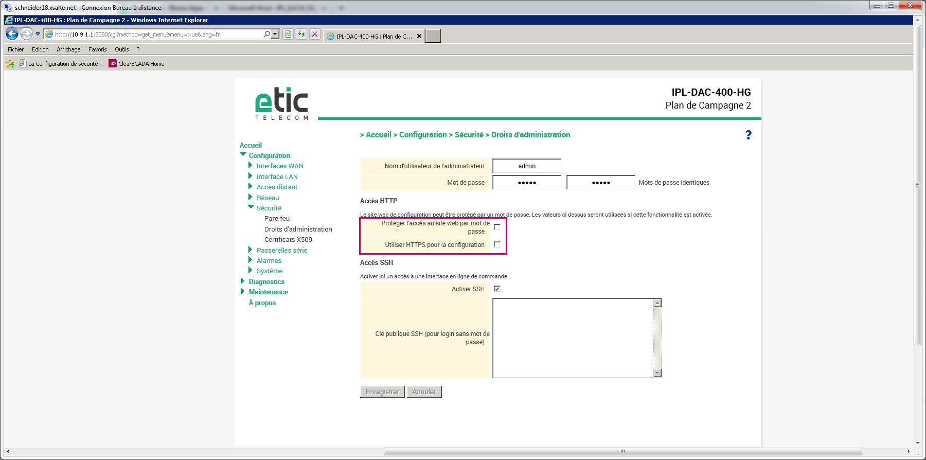 Une fois l'IP usine paramétrée sur le PC de l'intervenant, il faut aller sur la page Web et aller dans le menu Configuration>Sécurité>Droits d'accès (voir image).