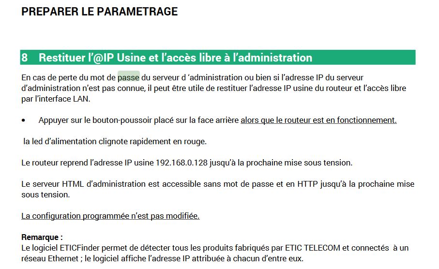 Dans le manuel de configuration IPL page 18, il est expliqué comment retourner en configuration usine ce qui a pour effet de désactiver la protection par MdP de l'ETIC et de lui donner l'adresse usine 192.168.0.128: