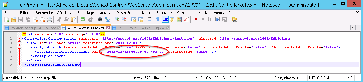 Le fichier C:\Programmes\Schneider Electric\Conext Control\PVDBConsole\Configurations\Nom_SPV\Se.Pv.Controllers.cfg contient la date de la dernière journée valide (normalement la veille).