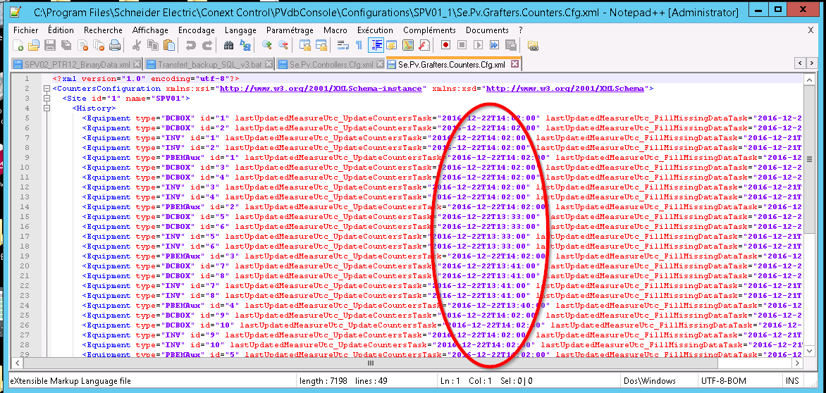 ===== Update counters ===== Il faut mettre à jour les compteurs avant d'effectuer une consolidation des données afin de relancer les calculs effectués dans la base de données SQL. Pour cela, éditez le ou les fichiers “Se.Pv.Grafters.Counters.Cfg.xml” qui se trouve(nt) sous “c:\Programmes\Schneider Electric\Conext Control\PVdbConsole\Configurations\SPVxx_xx\”