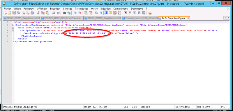 1. Le fichier C:\Program Files (x86)\Schneider Electric\Conext Control\PVDBEngine\PVdbConsole\Configurations\Nom_Site\Se.Pv.Controllers.cfg contient la date de la dernière journée valide (normalement la veille). Il faut changer la date en écrivant la date à partir de laquelle vous voulez faire la relance.
