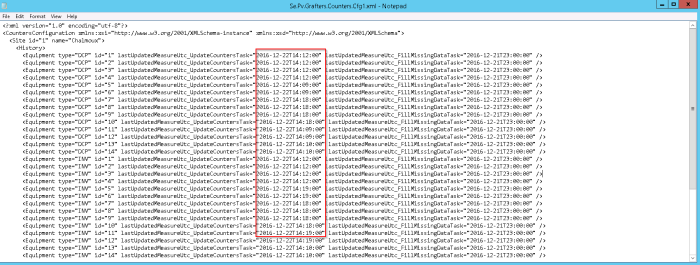 2. Modifier aussi le fichier C:\Program Files (x86)\Schneider Electric\Conext Control\PVDBEngine\PVdbConsole\Configurations\Nom_Site\Se.Pv.Grafters.Counters.cfg et modifier la 1ère date de chaque ligne à la date à partir de laquelle vous voulez faire la relance.