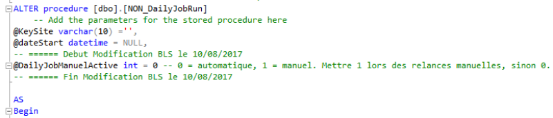 Sur ces procédures, il faut mettre à “1” (manuel) le paramètre @DailyJobManualActive en haut des deux procédures “Daily job Run” et “Up Alarm”: